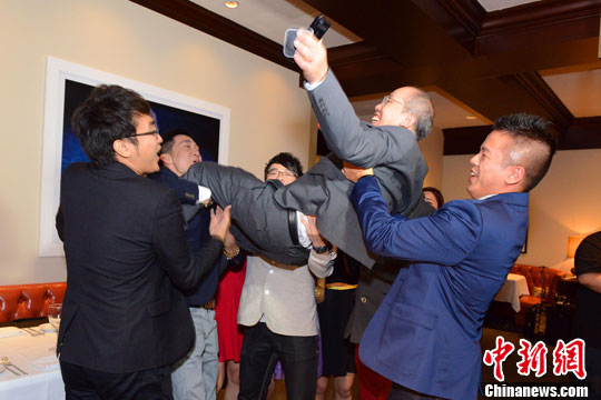 图为比赛结束后参赛者兴奋地把阮建华抛向空中,庆祝比赛圆满落幕。中新社发 龚文谟 摄
