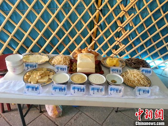 10日,第七届“察干伊德文化节”在正蓝旗开幕。据悉,在为期两天的活动中,内蒙古、蒙古国的奶制品制作高手们汇聚一堂,各项传统奶制品活动轮番上映。图为多种奶制品展台。高家鑫 摄
