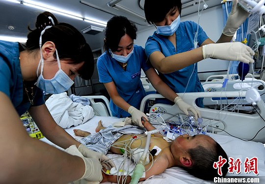 9月10日,在首都医科大学宣武医院的ICU病房内,医护人员在为刚刚做完心脏修复手术的孩子进行术后的护理工作。中新社发 陆欣 摄