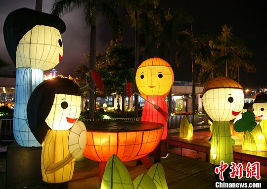 9月10日,《月满香江亮在家》彩灯在香港文化中心露天广场展出,以6组别具特色的彩灯展示其乐融融的家庭生活。中新社发 洪少葵 摄