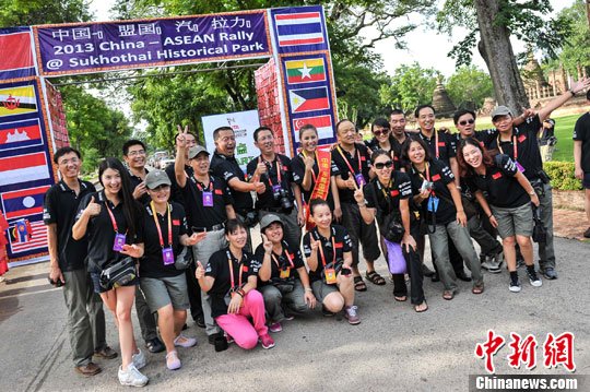 9月10日,2013中国-东盟国际汽车拉力赛在泰国素可泰举行发车仪式。图为车手与工作人员留影。中新社发 洪坚鹏 摄