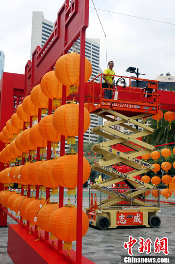 9月11日,香港维园彩灯会正加紧布置。场内彩灯除了香港旅游发展局的《彩灯大观园》外,还有巨型财神彩灯《运财小福星》。中新社发 洪少葵 摄