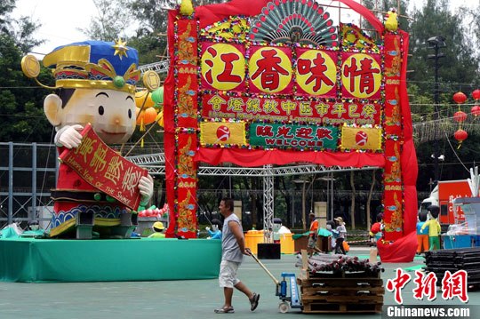 9月11日,香港维园彩灯会正加紧布置。场内彩灯除了香港旅游发展局的《彩灯大观园》外,还有巨型财神彩灯《运财小福星》。中新社发 洪少葵 摄
