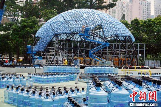 9月11日,香港维园彩灯会正加紧布置名为“悦满中秋”的半月形巨型彩灯。彩灯高10米,直径20米,以7,000个回收弃置水樽和节能LED灯泡建成。亮灯仪式于9月14日下午6时30分举行。中新社发 洪少葵 摄