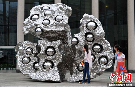 9月11日,两米多高、名为“莲说”的不锈钢“莲蓬”亮相武汉街头。中新社发 张畅 摄