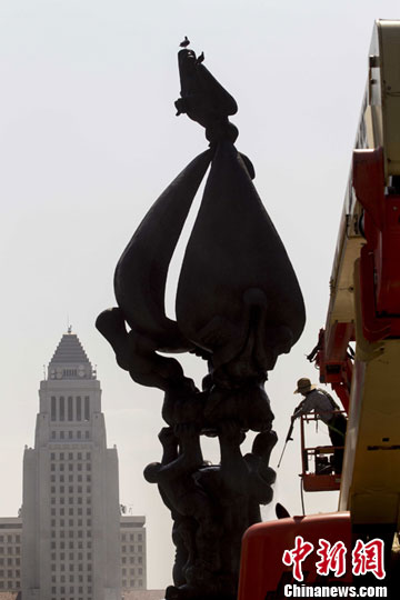 图:洛杉矶工人清洗雕塑“地球的和平”