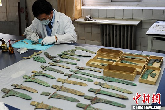 9月11日下午,甘肃省博物馆文物保护修复中心一间工作室的桌面上,整齐排列着数十件存在自然破裂和病害等威胁而亟待修复的戈、矛、镜等青铜器文物,两名文物修复专家聚精会神的先对其进行病理分析,然后“对症下药”实施修复还原。中新社发 杨艳敏 摄