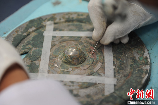 9月11日下午,甘肃省博物馆文物保护修复中心一间工作室的桌面上,整齐排列着数十件存在自然破裂和病害等威胁而亟待修复的戈、矛、镜等青铜器文物,两名文物修复专家聚精会神的先对其进行病理分析,然后“对症下药”实施修复还原。中新社发 杨艳敏 摄