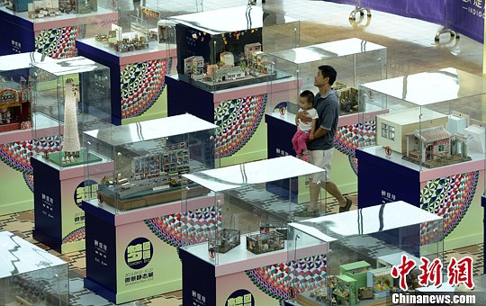 9月11日,68个微景静态模型在北京某商场亮相,这些模型反映了上世纪60、70年代香港、台湾等地生活风貌。图为家长带着孩子参观模型。中新社发 侯宇 摄