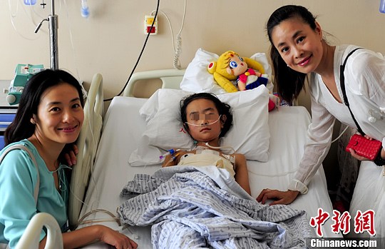 9月11日,中央电视台新闻频道主持人耿萨、慕林杉及东方时空的编辑们,来到北京人民医院探望了刚刚做完先心病手术的来自舟曲的11岁女孩冯双红。中新社发 陆欣 摄