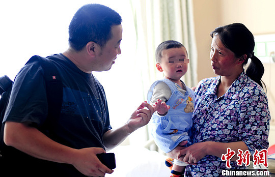 图为央视东方时空栏目的编辑看望9个月大的藏族娃娃达瓦扎西。中新社发 陆欣 摄