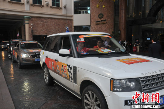 2013中国-东盟汽车拉力赛马来西亚站发车仪式18日在吉隆坡举行。该站发车仪式后,参赛车队将踏上返程征程。参赛的26辆车组成的车队正式踏上返程的征程。中新社发 黄鸿斌 摄