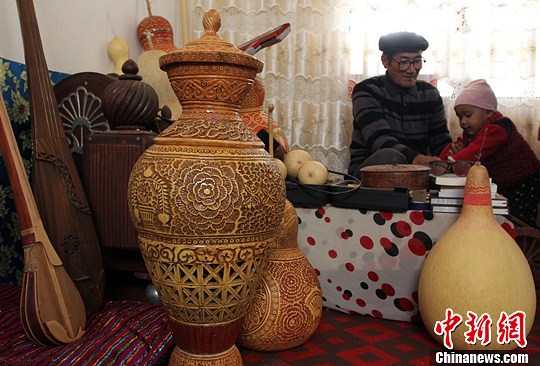 在新疆沙雅县有一位叫艾则孜·买买提的60岁老艺人,因其擅长葫芦雕刻艺术,被称作“葫芦王”。图为9月18日,记者来到老人家中,老人向记者介绍他的葫芦雕刻作品。中新社发 杨喆 摄