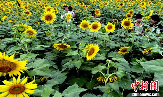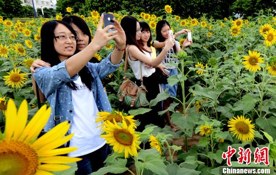 9月18日,总面积约30000平方米的“向日葵花海”在福州南江滨堤外公园盛放。图为几位“90后”女青年用手机拍摄“向日葵花海"美景。中新社发 刘可耕 摄