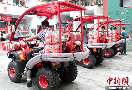 每辆消防摩托车还配有10盘水带、2支水枪、6具灭火器、1台机动抽水泵以及探照灯等。肖洪环 摄