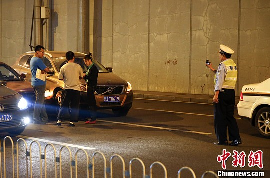 9月18日,北京迎来中秋节前晚高峰,西直门附近行驶的两辆车发生摩擦。中新社发 刘关关 摄