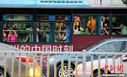 9月18日傍晚,福州市区内一辆公交车在车流中缓慢前行,许多乘坐公交出行的福州市民被堵在路上。当日是中秋节假期前一天,福州市区迎来了节前车流高峰。中新社发 张斌 摄