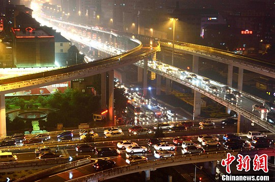 9月18日晚,内蒙古呼和浩特雨势时大时小不间断在下,市内多路段拥堵严重。图为鼓楼立交桥路段车辆排起长龙。中新社发 刘文华 摄