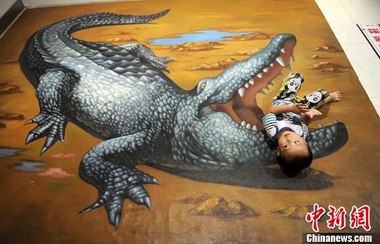 图为一小男孩正在3D艺术画上玩耍。陈超 摄