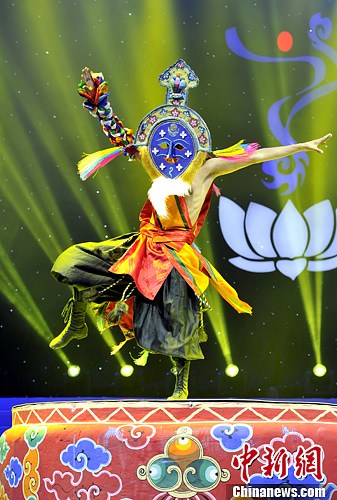 9月18日晚,在西藏电视台举办的第二届西藏自治区电视专业舞蹈大赛中,由西藏自治区歌舞团首创,将藏戏和舞蹈艺术相结合的蓝面具藏戏独舞《温巴新韵》首次与世人见面,就赢得在场观众和评委的肯定,从进入决赛的11支舞蹈中脱颖而出,一举摘得当晚头魁。中新社发 李林 摄
