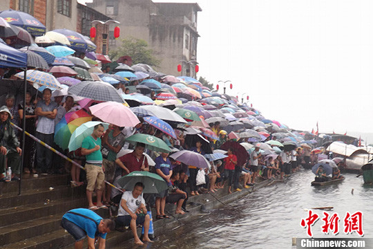 9月24日,广西融安县在大雨中进行龙舟大赛,数万居民沿江冒雨观看比赛。 方齐 摄