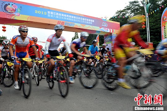 9月24日,“2013年首届江西省海峡两岸自行车联谊赛”暨“第六届泛长珠闽国际自行车挑战赛”最后一站在江西靖安县三爪仑风景区举行,经过近两个小时的骑行,最终来自中国上海及中华台北的选手分获男子山地车公开组冠、亚军。当天上午的比赛赛道设在三爪仑国家示范森林公园风光带,沿途都是蜿蜒曲折、葱葱郁郁的山区公路,全程为55公里,其中有8公里爬坡路段。刘占昆 摄