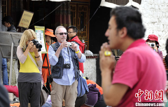 9月24日,外国游客在拉萨市大昭寺广场上拍照。中新社发 李林 摄