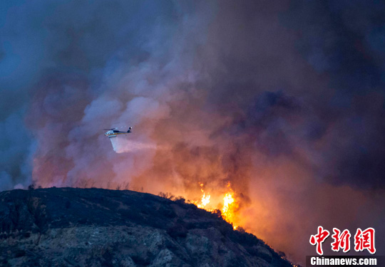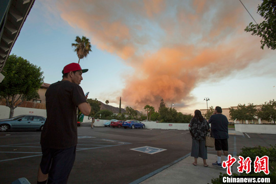 当地时间9月23日,美国洛杉矶东北方向约30公里处的天使国家森林发生火灾,目前火灾面积不断扩大,消防部门出动多部灭火直升机和超过150名地面消防人员灭火。图为民众在观看山火。中新社发 林戈 摄