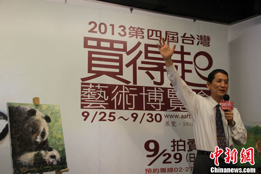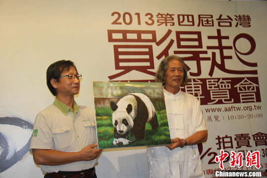 第四届“台湾买得起艺术博览会”将于9月25日在台北登场,共展出130多位台湾艺术家创作的1300多件作品,创下展出最多台湾艺术家画作的纪录。同时,首创台北市立动物园熊猫宝宝“圆仔”画作公益捐赠。图为捐赠仪式。中新社发 冽玮 摄