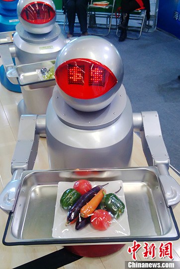 9月25日,黑龙江绿色食品产业博览会上机器人服务员正在端菜。博览会上,机器人分工明确,有煮水饺机器人、煮面机器人、炒菜机器人、地面送餐机器人、空中传菜机器人、迎宾机器人等18个各式机器人。中新社发 胡迪 摄