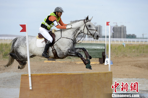 9月25日,在内蒙古锡林浩特举行的第二届中国马术大赛进入第三日的赛程,三项越野障碍赛受到关注。中新社发 刘文华 摄