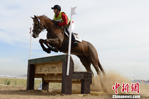 9月25日,在内蒙古锡林浩特举行的第二届中国马术大赛进入第三日的赛程,三项越野障碍赛受到关注。中新社发 刘文华 摄