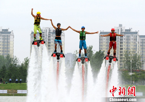 9月25日,2013年第15届亚洲赛艇锦标赛在安徽六安月亮岛水域开桨,赛前艺术滑水、水上摩托、水上飞人表演引起观众一片惊叹。来自中、日、韩、泰等亚洲国家的300余名运动员将在此间参与16个赛艇项目的角逐。中新社发 张娅子 摄