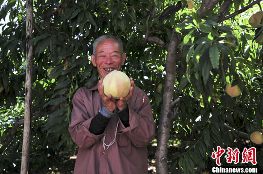 9月25日,出产桃“冠军”的桃园引来众多摘桃客。中新社发 张勇 摄