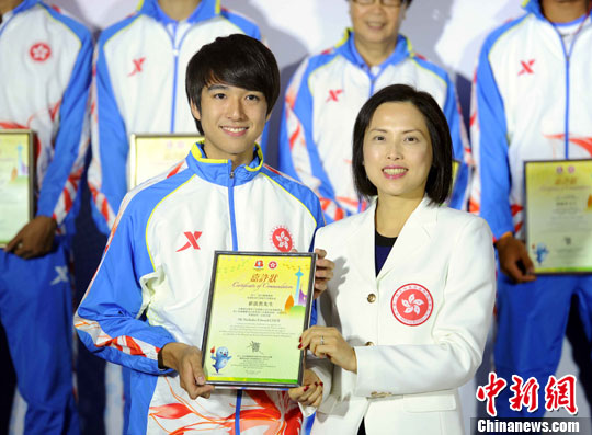 9月25日,香港特别行政区康乐及文化事务署署长兼筹委会副主席冯程淑仪,颁发嘉许奖状在个人男子花剑中摘下一面铜牌的崔浩然。中新社发 谭达明 摄