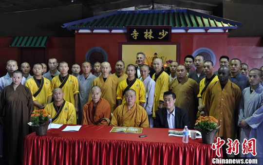 当地时间10月10日,海内外知名度和影响力俱高的中国少林寺方丈释永信大和尚率领36名身怀绝技的武僧们抵达洛杉矶,他们将参加在这里举行的首届北美少林寺文化节,向美国主流社会和海外华人华侨展示少林寺独具特色的东方文化。中新社发 毛建军 摄