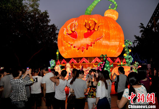 10月10日晚,广州长隆欢乐世界举行了大型的自贡南瓜灯亮灯暨长隆“欢乐万圣节”启动仪式,南瓜灯组总体大小为12米×10米,相当于三层楼高,为世界上最大的自贡工艺南瓜灯。中新社发 刘卫勇 摄