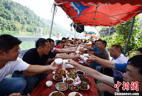 10月10日,广西桂林龙胜各族自治县瓢里镇迎来传统鱼宴节,瓢里镇4000多名群众开展万尾活鱼放生、千人摸鱼、民间大厨鱼宴比赛、共食鲜鱼宴等活动,吸引了近万名游客慕名前来品尝现捕现煮的鲜美鱼宴。图为慕名前来的游客和群众一同品尝现捕现煮的鲜美鱼宴。中新社发 石农兵 摄