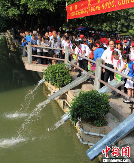 10月10日,越南谅山省青少年代表团一行75人抵达中国广西崇左市访问。图为中越青少年在凭祥市举行鱼类放生活动。中新社发 董兴生 摄