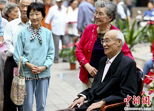 10月11日,老寿星们在拍摄照片。中新社发 泱波 摄
