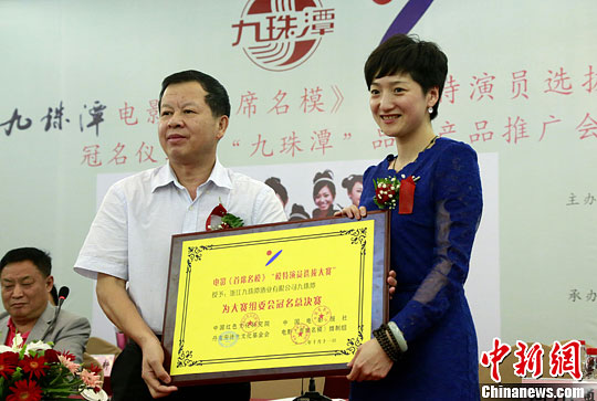 10月11日,九珠潭电影《首席名模》“模特演员选拔大赛”组委会在浙江温州举行总决赛冠名仪式。今年年底全国选区将统一进行“模特演员选拔大赛”总决赛,全国总决赛总冠军为本片领衔主演。图为现场冠名授牌。中新社发 赵隽 摄