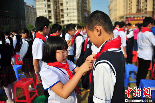 10月11日,中越边境青少年友好交流活动在广西崇左市举行。为增进友谊互信,中越青少年互换红领巾。中新社发 蒋雪林 摄
