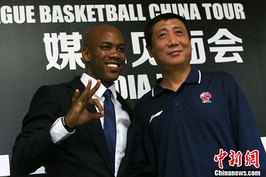 当天,马布里在北京召开新闻发布会,正式宣布与北京队续约三年,加上此前还剩下一年的合同,他将会在北京效力至2017年。届时,马布里将在北京结束其球员生涯。图为马布里和京首钢俱乐部总经理袁超。