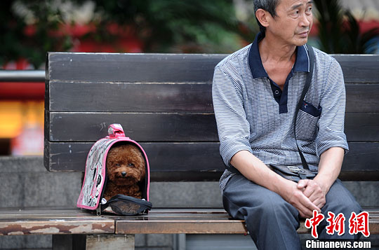 10月11日,重庆街头一狗主人用提包式的狗窝装着小狗在街头休闲娱乐,小狗不停探出头来卖萌。