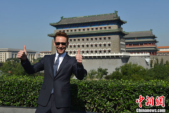 10月11日,好莱坞大片《雷神2:黑暗世界》中饰演雷神弟弟“洛基”的演员汤姆·希德勒斯顿亮相北京,在蓝天下的前门(正阳门)前大摆酷姿留影。中新社发 李学仕 摄