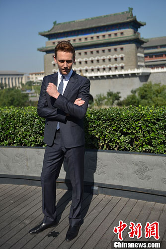10月11日,好莱坞大片《雷神2:黑暗世界》中饰演雷神弟弟“洛基”的演员汤姆·希德勒斯顿亮相北京,在蓝天下的前门(正阳门)前大摆酷姿留影。中新社发 李学仕 摄