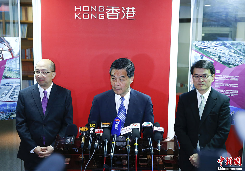 10月23日,香港特别行政区行政长官梁振英在香港驻京办会见记者时表示,与张德江会面时自己表达了特区和特区政府感谢中央大力支持特区政府跟进马尼拉人质事件,包括与菲律宾总统府等有关方面的联系工作,期望中央能继续支持有关工作。中新社发 刘关关 摄