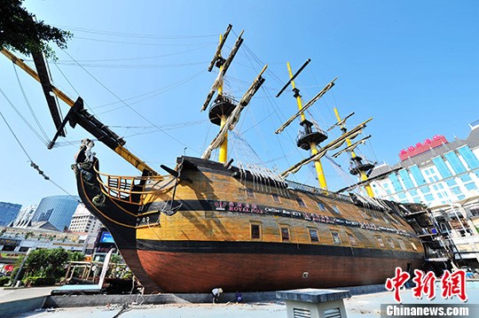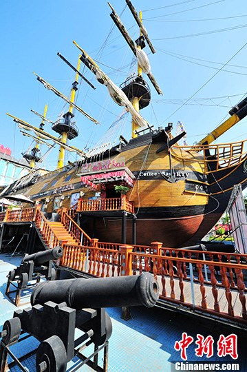 10月24日,在厦门市区有艘仿造英国古战舰“胜利号”建造而成的酒吧,“战舰”共四层面积达2500平方米,不仅成为市民一个娱乐场所,也成为市区里的一个景点。中新社发 张斌 摄