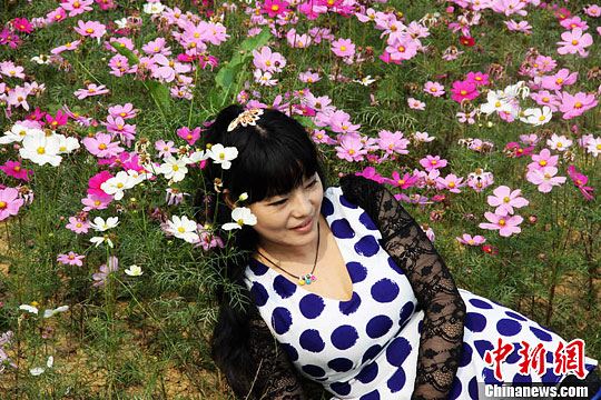 一位游客躺在格桑花旁合影。唐小晴 摄