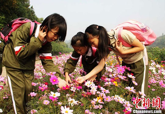 三位小学生正在观赏格桑花。唐小晴 摄